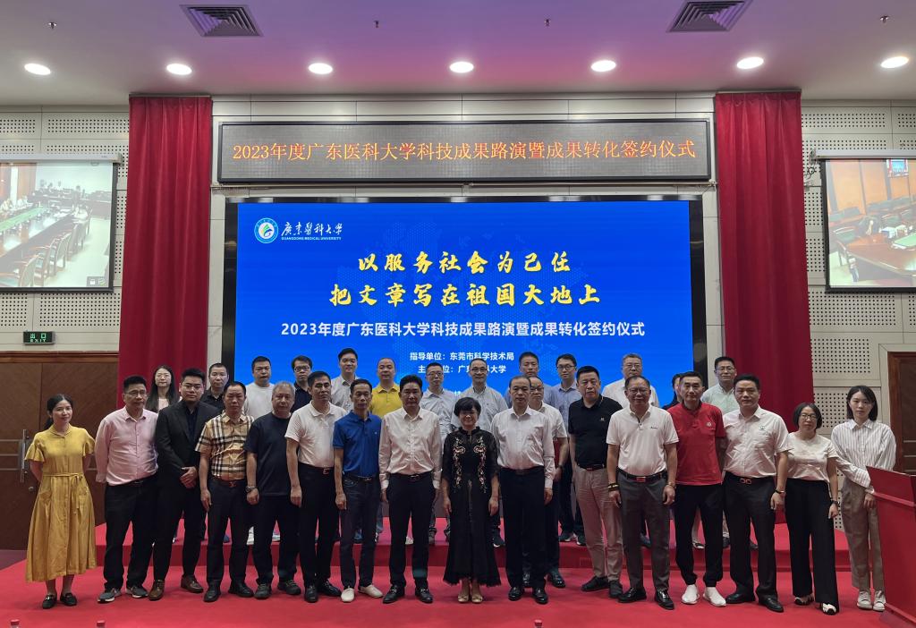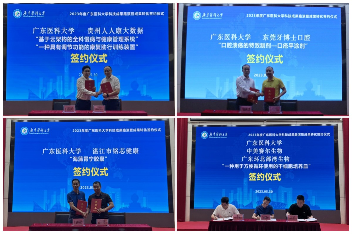 经过路演展示,“Cf48肾损伤标志物及在肾损伤治疗药物中的用途”“基于云架构的全科慢病与健康管理系统”2项科研成果分别与广州康润生物科技有限公司和贵州人人康大数据科技有限公司签订转让协议,单项成果转让金额最高为100万元。“一种新型家用视力表”“高良姜提取物在制备抗骨质疏松药品方面的应用”“口腔溃疡的特效制剂—口疮平涂剂”“马尾藻提取物制备方法及其用途”“H3O+水合氢离子技术成果”“一种用于方便循环使用的干细胞培养皿”“仙珍骨康胶囊”“海蒲胃宁胶囊”等8项科研成果分别与广东爱唯视医疗科技有限公司、贵州黔棠姜生物科技有限公司、东莞牙博士口腔门诊部有限公司、广东九天绿药业有限公司、广东翠京元国际投资有限公司、中美赛尔生物科技(广东)有限公司、广东金安医药发展有限公司、湛江市铭芯健康管理有限公司等签订意向转化协议。