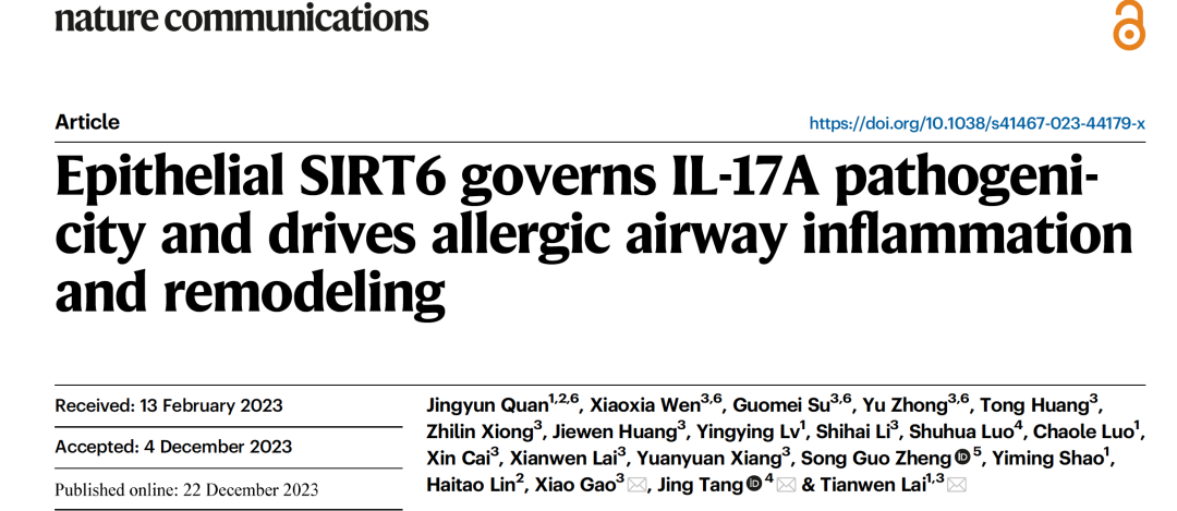 近日,伟德国际1946源于英国附属东莞第一医院/第二临床医学院教授、东莞呼吸医学研究所所长赖天文团队在国际顶级学术期刊Nature子刊Nature Communications发表题为“Epithelial SIRT6 governs IL-17A pathogenicity and drives allergic airway inflammation and remodeling”(气道上皮SIRT6调控IL-17A致病性导致哮喘气道炎症及重构)的重要研究成果。这是我校师生首次以伟德国际1946源于英国为独立完成单位在Nature 子刊发表重要成果。